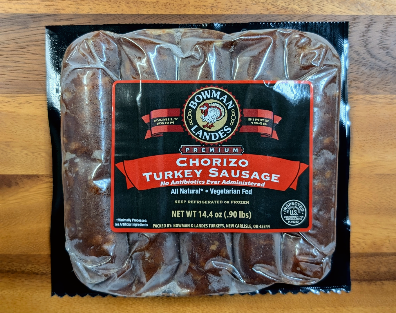 Our Chorizo Turkey Sausage is a perfect way to spice up your barbeque. Each package contains five 2.9 oz turkey bratwurst links.